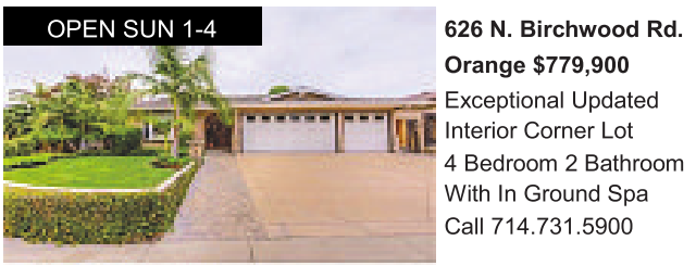 626 N. Birchwood Rd. Orange $779,900 Exceptional Updated Interior Corner Lot 4 Bedroom 2 Bathroom With In Ground Spa Call 714.731.5900