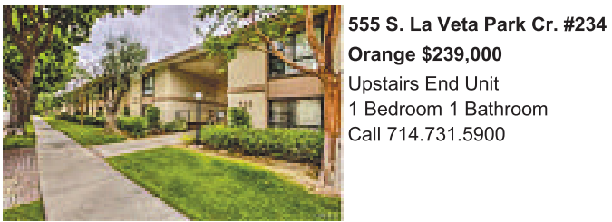 555 S. La Veta Park Cr. #234 Orange $239,000 Upstairs End Unit 1 Bedroom 1 Bathroom Call 714.731.5900