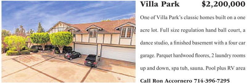 Villa Park $2,200,000 OneofVillaPark’sclassic homesbuilt on aone acre lot. Full size regulation hand ball court, a dancestudio, afinished basement with afourcar garage.Parquet hardwood floores, 2laundry rooms up anddown, spatub,sauna. Pool plus RV area Call Ron Accornero 714-396-7295