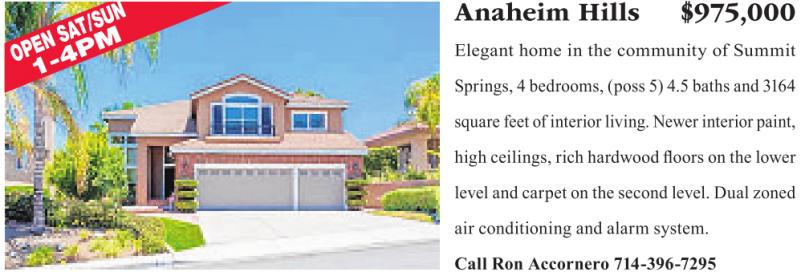 Anaheim Hills $975,000 Elegant home in the community of Summit Springs, 4bedrooms, (poss 5) 4.5baths and3164 squarefeetofinteriorliving. Newerinteriorpaint, high ceilings,richhardwood floorsonthe lower leveland carpet on thesecondlevel.Dualzoned air conditioning and alarm system. Call Ron Accornero 714-396-7295