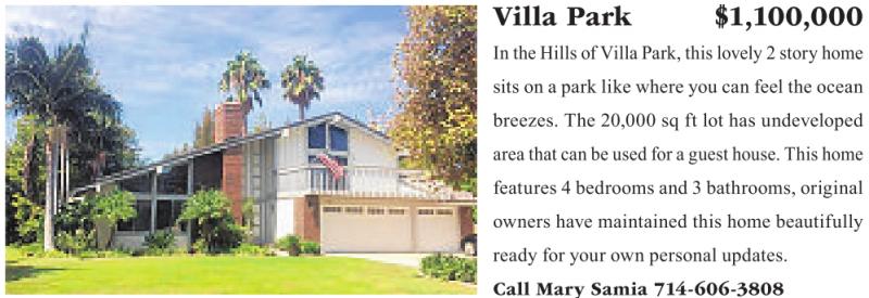Villa Park $1,100,000 In theHillsofVilla Park,thislovely 2story home sits on aparklikewhere youcan feel theocean breezes. The 20,000 sq ft lot has undeveloped area that canbeusedfor aguest house.Thishome features 4bedroomsand 3bathrooms,original owners have maintained this home beautifully ready for your own personalupdates. Call Mary Samia 714-606-3808 See also