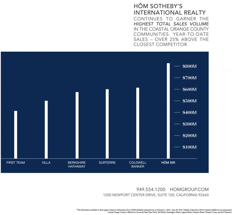 HÔM SOTHEBY’S INTERNATIONAL REALTY CONTINUES TO GARNER THE HIGHEST TOTAL SALES VOLUME IN THE COASTAL ORANGE COUNTY COMMUNITIES. YEAR-TO-DATE SALES – OVER 25% ABOVE THE CLOSEST COMPETITOR. $800M $700M FIRST TEAM VILLA BERKSHIRE HATHAWAY $600M $500M $400M $300M $200M $100M SURTERRE COLDWELL BANKER HÔM SIR 949.554.1200 HOMGROUP.COM 1200 NEWPORT CENTER DRIVE, SUITE 100, CALIFORNIA 92660 *The information included on these pages is based on information from CDAR Multiple Listing Service as of January 1,2016 -June 30, 2016. Display of data from MLS is deemed reliable but not guaranteed. Coastal Orange County is defined as Corona del Mar, Dana Point, Seal Beach, Huntington Beach, Laguna Beach, Newport Beach, Newport Coast, and San Clemente.