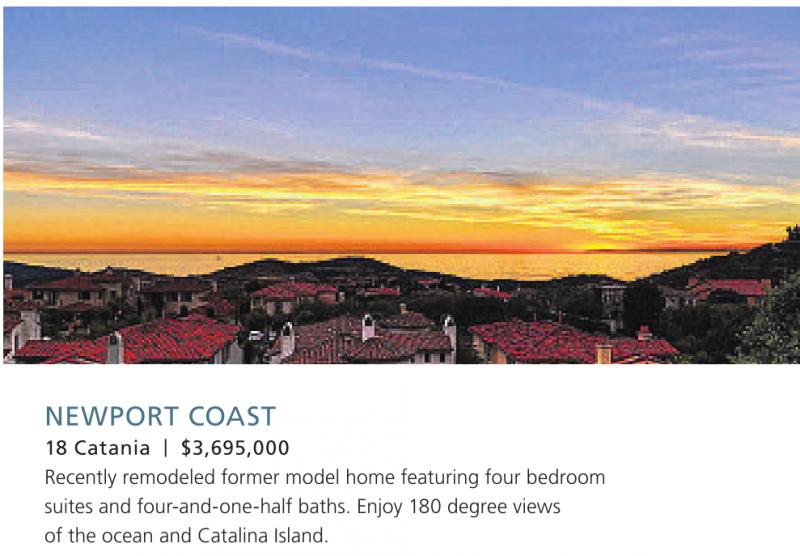 18 Catania | $3,695,000 Recently remodeled former model home featuring four bedroom suites and four-and-one-half baths. Enjoy 180 degree views of the ocean and Catalina Island.