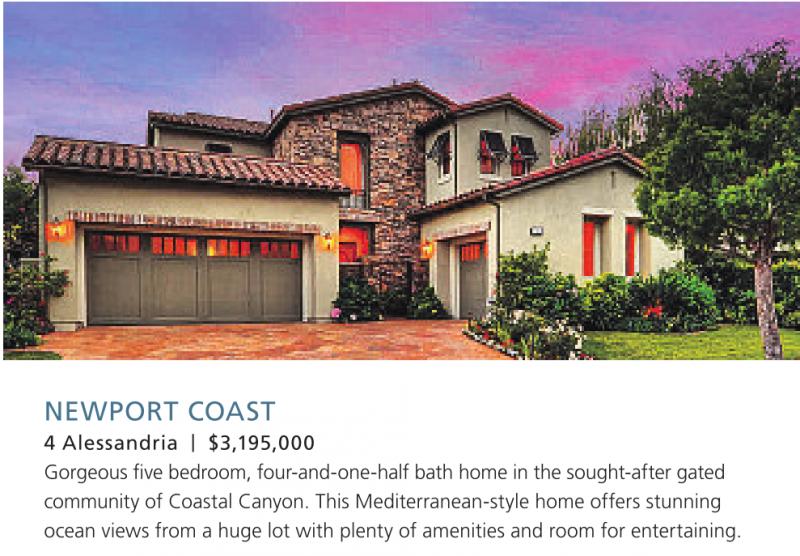 4 Alessandria | $3,195,000 Gorgeous five bedroom, four-and-one-half bath home in the sought-after gated community of Coastal Canyon. This Mediterranean-style home offers stunning ocean views from a huge lot with plenty of amenities and room for entertaining.