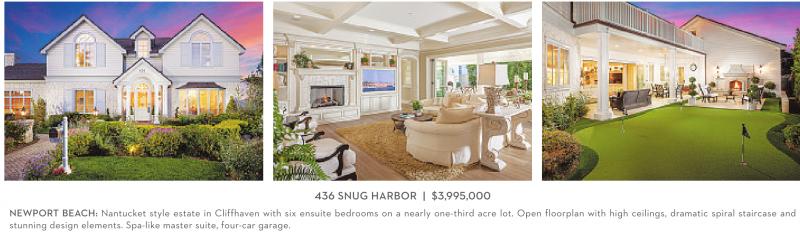 NEWPORT BEACH: Nantucket style estate in Cliffhaven with six ensuite bedrooms on a nearly one-third acre lot. Open floorplan with high ceilings, dramatic spiral staircase and stunning design elements. Spa-like master suite, four-car garage.
