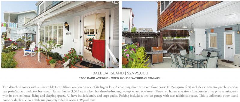 Two detached homes with an incredible Little Island location on one of its largest lots. A charming three bedroom front house (1,752 square feet) includes a romantic porch, spacious rear patio/garden, and peek bay view. The rear house (1,541 square feet) has three bedrooms, two upper and one lower. These two homes effectively functions as three private units, each with its own entrance, living and sleeping spaces. All have inside laundry and large patios. Parking includes a two-car garage with two additional spaces. This is unlike any other island home or duplex. View details and property video at www.1706park.com.