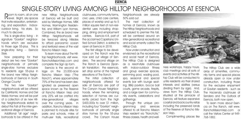 The two new “Gavilan” neighborhoods will be offered by CalAtlantic Homes and Del Webb Homes; and will be part of a collection of six new Hilltop Neighborhoods slated to debut this Fall at the inter-generational village of Esencia.