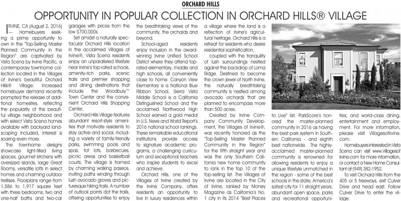 own in the “Top-selling Master Planned Community in the region” are captivated by Vista scena by Irvine Pacific, a contemporary townhome collection located in the Villages of Irvine’s beautiful orchard Hills® Village. Increased homebuyer demand recently prompted the release of additional homesites, reflecting the popularity of this beautiful village neighborhood and with select Vista scena homes available with backyard landscaping included, interest is soaring even more.