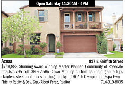 Open Saturday 11:30AM -4PM Azusa 817E.Griffith Street $748,888 Stunning Award-Winning Master Planned Community of Rosedale boasts 2795 sqft 3BD/2.5BA Crown Molding custom cabinets granite tops stainless steelappliances loft huge backyard HOA Jr Olympicpool/spa Gym Fidelity Realty &Dev.Grp./AlbertPerez, Realtor 714-319-8035