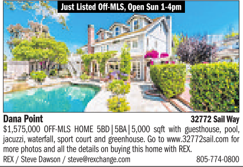 Just Listed Off-MLS, Open Sun 1-4pm Dana Point 32772Sail Way $1,575,000 OFF-MLS HOME 5BD|5BA|5,000 sqft with guesthouse, pool, jacuzzi,waterfall, sportcourtand greenhouse.Gotowww.32772sail.comfor more photos and all the details on buyingthis home with REX. REX/Steve Dawson /steve@rexchange.com 805-774-0800