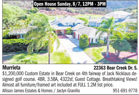 Open House Sunday,8/7, 12PM -3PM Murrieta 22363 Bear Creek Dr.S. $1,200,000 Custom Estate in Bear Creekon4th fairway of Jack Nicklausdesigned golf course. 4BR, 3.5BA, 4322sf, Guest Cottage. Breathtaking Views! Almost all furniture/framed artincluded at FULL 1.2M list price. Allison James Estates &Homes /Jaclyn Granillo 951-691-9778