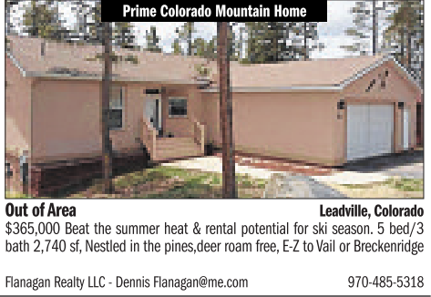 Prime Colorado Mountain Home Out of Area Leadville, Colorado $365,000 Beat the summer heat &rental potential for ski season. 5bed/3 bath 2,740 sf, Nestled in the pines,deer roam free, E-Z to Vail or Breckenridge FlanaganRealtyLLC -DennisFlanagan@me.com 970-485-5318