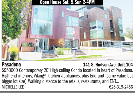 Open House Sat. &Sun 2-4PM Pasadena 141S.Hudson Ave. Unit 104 $950000 Contemporary20’ High ceiling Condolocated in heartofPasadena. High-end interiors,Viking® kitchenappliances, plus End unit (samevalue but bigger lot size).Walking distance to the retails, restaurants, and ENT... MICHELLE LEE 626-319-2456