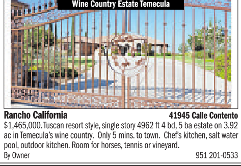 Wine Country Estate Temecula Rancho California 41945Calle Contento $1,465,000.Tuscan resortstyle, single story4962 ft 4bd, 5baestateon3.92 ac in Temecula’swine country. Only 5mins. to town. Chef’skitchen,salt water pool, outdoor kitchen. Roomfor horses, tennis or vineyard. By Owner 951201-0533