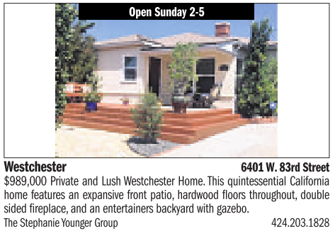 Open Sunday 2-5 Westchester 6401 W. 83rd Street $989,000 Private and Lush WestchesterHome. This quintessential California home featuresanexpansive frontpatio, hardwood floors throughout, double sided fireplace,and an entertainers backyard with gazebo. TheStephanie Younger Group 424.203.1828