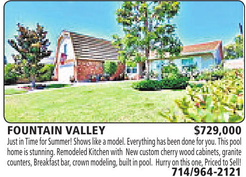 FOUNTAIN VALLEY $729,000 Just in Time forSummer! Showslikeamodel. Everythinghas been done for you. This pool home is stunning.RemodeledKitchen with Newcustomcherry wood cabinets, granite counters, Breakfastbar,crown modeling,built in pool. Hurryonthis one, PricedtoSell! 714/964-2121 See also