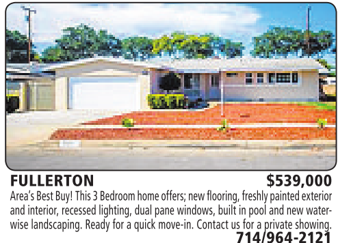 FULLERTON $539,000 Area’s Best Buy! This 3Bedroomhomeoffers; new flooring, freshlypainted exterior and interior, recessed lighting, dual pane windows, built in pool and new waterwise landscaping. Ready for aquick move-in. Contact usfor aprivate showing. 714/964-2121 See also
