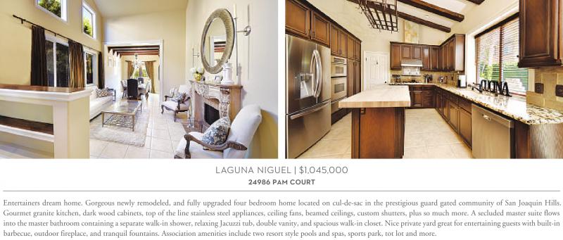 LAGUNA NIGUEL | $1,045,000 24986 pam court Entertainers dream home. Gorgeous newly remodeled, and fully upgraded four bedroom home located on cul-de-sac in the prestigious guard gated community of San Joaquin Hills. Gourmet granite kitchen, dark wood cabinets, top of the line stainless steel appliances, ceiling fans, beamed ceilings, custom shutters, plus so much more. A secluded master suite flows into the master bathroom containing a separate walk-in shower, relaxing Jacuzzi tub, double vanity, and spacious walk-in closet. Nice private yard great for entertaining guests with built-in barbecue, outdoor fireplace, and tranquil fountains. Association amenities include two resort style pools and spas, sports park, tot lot and more.