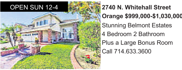 2740 N. Whitehall Street Orange $999,000-$1,030,000 Stunning Belmont Estates 4 Bedroom 2 Bathroom Plus a Large Bonus Room Call 714.633.3600