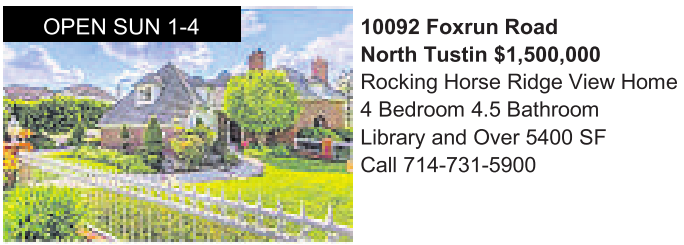 OPEN SUN 1-4 10092 Foxrun Road North Tustin $1,500,000 Rocking Horse Ridge View Home 4 Bedroom 4.5 Bathroom Library and Over 5400 SF Call 714-731-5900