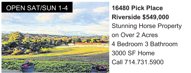 16480 Pick Place Riverside $549,000 Stunning Horse Property on Over 2 Acres 4 Bedroom 3 Bathroom 3000 SF Home Call 714.731.5900