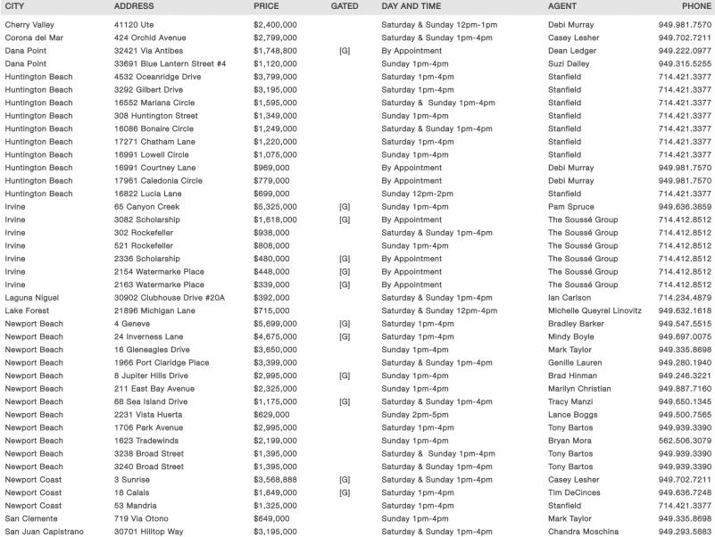 Cherry Valley 41120 Ute $2,400,000 Saturday & Sunday 12pm-1pm Debi Murray 949.981.7570 Corona del Mar 424 Orchid Avenue $2,799,000 Saturday & Sunday 1pm-4pm Casey Lesher 949.702.7211 Dana Point 32421 Via Antibes $1,748,800 [G] By Appointment Dean Ledger 949.222.0977 Dana Point 33691 Blue Lantern Street #4 $1,120,000 Sunday 1pm-4pm Suzi Dailey 949.315.5255 Huntington Beach 4532 Oceanridge Drive $3,799,000 Saturday 1pm-4pm Stanfield 714.421.3377 Huntington Beach 3292 Gilbert Drive $3,195,000 Saturday 1pm-4pm Stanfield 714.421.3377 Huntington Beach 16552 Mariana Circle $1,595,000 Saturday & Sunday 1pm-4pm Stanfield 714.421.3377 Huntington Beach 308 Huntington Street $1,349,000 Sunday 1pm-4pm Stanfield 714.421.3377 Huntington Beach 16086 Bonaire Circle $1,249,000 Saturday & Sunday 1pm-4pm Stanfield 714.421.3377 Huntington Beach 17271 Chatham Lane $1,220,000 Saturday 1pm-4pm Stanfield 714.421.3377 Huntington Beach 16991 Lowell Circle $1,075,000 Sunday 1pm-4pm Stanfield 714.421.3377 Huntington Beach 16991 Courtney Lane $969,000 By Appointment Debi Murray 949.981.7570 Huntington Beach 17961 Caledonia Circle $779,000 By Appointment Debi Murray 949.981.7570 Huntington Beach 16822 Lucia Lane $699,000 Sunday 12pm-2pm Stanfield 714.421.3377 Irvine 65 Canyon Creek $5,325,000 [G] Sunday 1pm-4pm Pam Spruce 949.636.3859 Irvine 3082 Scholarship $1,618,000 [G] By Appointment The Soussé Group 714.412.8512 Irvine 302 Rockefeller $938,000 Saturday & Sunday 1pm-4pm The Soussé Group 714.412.8512 Irvine 521 Rockefeller $808,000 Sunday 1pm-4pm The Soussé Group 714.412.8512 Irvine 2336 Scholarship $480,000 [G] By Appointment The Soussé Group 714.412.8512 Irvine 2154 Watermarke Place $448,000 [G] By Appointment The Soussé Group 714.412.8512 Irvine 2163 Watermarke Place $339,000 [G] By Appointment The Soussé Group 714.412.8512 Laguna Niguel 30902 Clubhouse Drive #20A $392,000 Saturday & Sunday 1pm-4pm Ian Carlson 714.234.4879 Lake Forest 21896 Michigan Lane $715,000 Saturday & Sunday 12pm-4pm Michelle Queyrel Linovitz 949.632.1618 Newport Beach 4 Geneve $5,699,000 [G] Saturday 1pm-4pm Bradley Barker 949.547.5515 Newport Beach 24 Inverness Lane $4,675,000 [G] Saturday 1pm-4pm Mindy Boyle 949.697.0075 Newport Beach 16 Gleneagles Drive $3,650,000 Sunday 1pm-4pm Mark Taylor 949.335.8698 Newport Beach 1966 Port Claridge Place $3,399,000 Saturday & Sunday 1pm-4pm Genille Lauren 949.280.1940 Newport Beach 8 Jupiter Hills Drive $2,995,000 [G] Sunday 1pm-4pm Brad Hinman 949.246.3221 Newport Beach 211 East Bay Avenue $2,325,000 Sunday 1pm-4pm Marilyn Christian 949.887.7160 Newport Beach 68 Sea Island Drive $1,175,000 [G] Saturday & Sunday 1pm-4pm Tracy Manzi 949.650.1345 Newport Beach 2231 Vista Huerta $629,000 Sunday 2pm-5pm Lance Boggs 949.500.7565 Newport Beach 1706 Park Avenue $2,995,000 Saturday 1pm-4pm Tony Bartos 949.939.3390 Newport Beach 1623 Tradewinds $2,199,000 Sunday 1pm-4pm Bryan Mora 562.506.3079 Newport Beach 3238 Broad Street $1,395,000 Saturday & Sunday 1pm-4pm Tony Bartos 949.939.3390 Newport Beach 3240 Broad Street $1,395,000 Saturday & Sunday 1pm-4pm Tony Bartos 949.939.3390 Newport Coast 3 Sunrise $3,568,888 [G] Saturday & Sunday 1pm-4pm Casey Lesher 949.702.7211 Newport Coast 18 Calais $1,849,000 [G] Saturday 1pm-4pm Tim DeCinces 949.636.7248 Newport Coast 53 Mandria $1,325,000 Saturday 1pm-4pm Stanfield 714.421.3377 San Clemente 719 Via Otono $649,000 Sunday 1pm-4pm Mark Taylor 949.335.8698 San Juan Capistrano 30701 Hilltop Way $3,195,000 Saturday & Sunday 1pm-4pm Chandra Moschina 949.293.5883