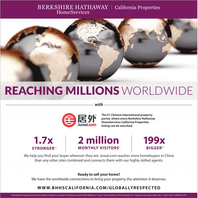 ©2016 BerkshireHathawayHomeServices California Properties is amember of the franchise system of BHH AffiliatesLLC.Source:**Data as of May20, 2016,fromBaidu.com. *Juwai.com: total unique visitors,May 1-May 31,2016. CalBRE 01317331