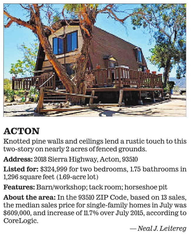 ACTON Knotted pine walls and ceilings lend a rustic touch to this two-story on nearly 2 acres of fenced grounds. Address: 2018 Sierra Highway, Acton, 93510 Listed for: $324,999 for two bedrooms, 1.75 bathrooms in 1,296 square feet (1.69-acre lot) Features: Barn/workshop; tack room; horseshoe pit About the area: In the 93510 ZIP Code, based on 13 sales, the median sales price for single-family homes in July was $609,000, and increase of 11.7%over July 2015, according to CoreLogic. —Neal J. Leitereg