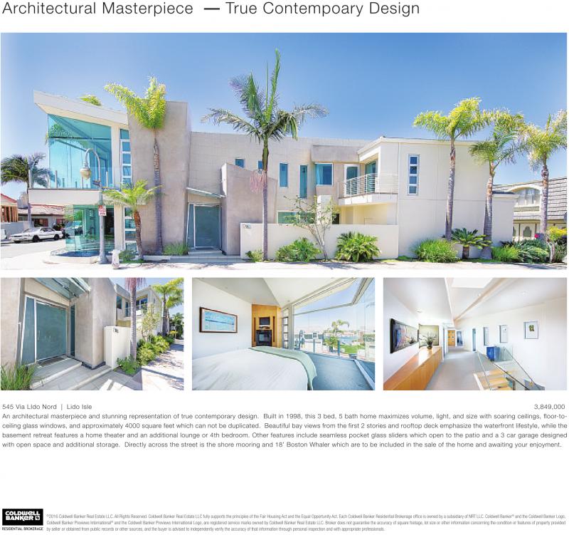 Architectural Masterpiece — True Contempoary Design 545 Via LIdo Nord | Lido Isle 3,849,000 An architectural masterpiece and stunning representation of true contemporary design. Built in 1998, this 3 bed, 5 bath home maximizes volume, light, and size with soaring ceilings, floor-toceiling glass windows, and approximately 4000 square feet which can not be duplicated. Beautiful bay views from the first 2 stories and rooftop deck emphasize the waterfront lifestyle, while the basement retreat features a home theater and an additional lounge or 4th bedroom. Other features include seamless pocket glass sliders which open to the patio and a 3 car garage designed with open space and additional storage. Directly across the street is the shore mooring and 18’ Boston Whaler which are to be included in the sale of the home and awaiting your enjoyment. © 2016 Coldwell Banker Real Estate LLC. All Rights Reserved. Coldwell Banker Real Estate LLC fully supports the principles of the Fair Housing Act and the Equal Opportunity Act. Each Coldwell Banker Residential Brokerage office is owned by asubsidiaryofNRT LLC. Coldwell Banker ® and the Coldwell Banker Logo, Coldwell Banker Previews International ® and the Coldwell Banker Previews International Logo, are registered service marks owned by Coldwell Banker Real Estate LLC. Broker does not guarantee the accuracy of square footage, lot size or other information concerning the condition or features of property provided by seller or obtained from public records or other sources, and the buyer is advised to independently verify the accuracy of that information through personal inspection and with appropriate professionals.