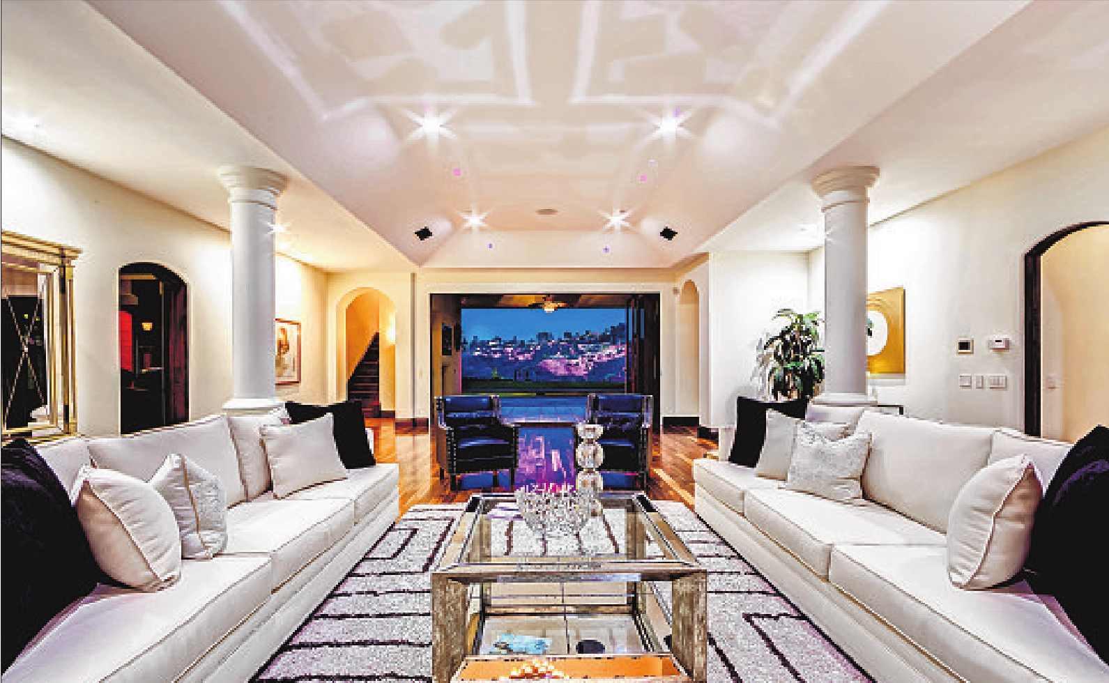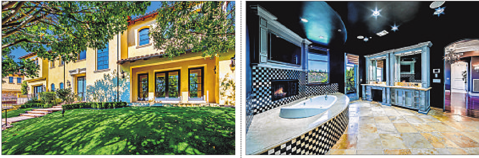 Despite the changes, there’s at least one room still fit for a rock star: A lower-level lounge — styled with black carpeting and a wallpaper of patterned skulls — has a DJ booth, a soundproof recording studio, a screening room and custom LED lighting. There’s even asteel pole for dancing.