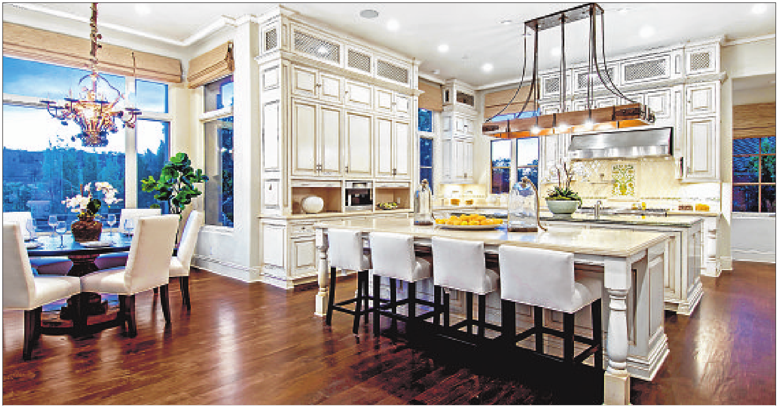 Within the 7,020 square feet of refined space are a two-story entry, a living room with a fireplace, a library/den with built-in bookshelves and a chef’s kitchen with an oversized island. A wine wall set within tempered glass sits off the formal dining room.