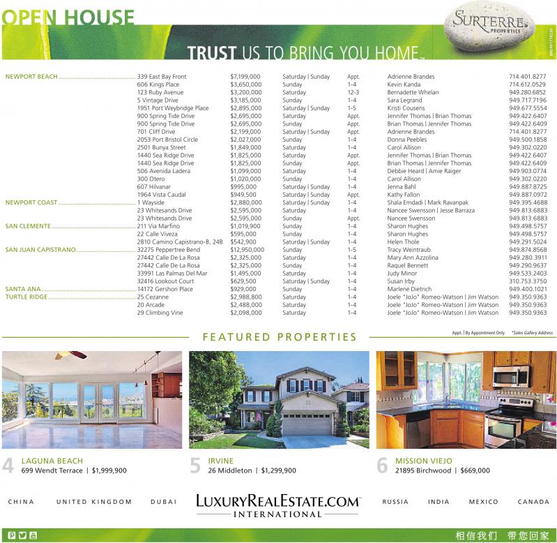 NEWPORT BEACH ............................................. 339 East Bay Front $7,199,000 Saturday | Sunday Appt. Adrienne Brandes 714.401.8277 606 Kings Place $3,650,000 Sunday 1-4 Kevin Kanda 714.612.0529 123 Ruby Avenue $3,200,000 Saturday 12-3 Bernadette Whelan 949.280.6852 5 Vintage Drive $3,185,000 Sunday 1-4 Sara Legrand 949.717.7196 1951 Port Weybridge Place $2,895,000 Saturday | Sunday 1-5 Kristi Cousens 949.677.5554 900 Spring Tide Drive $2,695,000 Saturday Appt. Jennifer Thomas | Brian Thomas 949.422.6407 900 Spring Tide Drive $2,695,000 Sunday Appt. Brian Thomas | Jennifer Thomas 949.422.6409 701 Cliff Drive $2,199,000 Saturday | Sunday Appt. Adrienne Brandes 714.401.8277 2053 Port Bristol Circle $2,027,000 Sunday 1-4 Donna Peebles 949.500.1858 2501 Bunya Street $1,849,000 Saturday 1-4 Carol Allison 949.302.0220 1440 Sea Ridge Drive $1,825,000 Saturday Appt. Jennifer Thomas | Brian Thomas 949.422.6407 1440 Sea Ridge Drive $1,825,000 Sunday Appt. Brian Thomas | Jennifer Thomas 949.422.6409 506 Avenida Ladera $1,099,000 Saturday 1-4 Debbie Heard | Amie Raiger 949.903.0774 300 Otero $1,020,000 Sunday 1-4 Carol Allison 949.302.0220 607 Hilvanar $995,000 Saturday | Sunday 1-4 Jenna Bahl 949.887.8725 1964 Vista Caudal $949,500 Saturday | Sunday Appt. Kathy Fallon 949.887.0972 NEWPORT COAST ............................................. 1 Wayside $2,880,000 Saturday | Sunday 1-4 Shala Emdadi | Mark Ravanpak 949.395.4688 23 Whitesands Drive $2,595,000 Saturday 1-4 Nancee Swensson | Jesse Barraza 949.813.6883 23 Whitesands Drive $2,595,000 Sunday Appt. Nancee Swensson 949.813.6883 SAN CLEMENTE................................................. 211 Via Marfino $1,019,900 Sunday 1-4 Sharon Hughes 949.498.5757 22 Calle Viveza $595,000 Sunday 1-4 Sharon Hughes 949.498.5757 2810 Camino Capistrano-B, 24B $542,900 Saturday | Sunday 1-4 Helen Thole 949.291.5024 SAN JUAN CAPISTRANO................................... 32275 Peppertree Bend $12,950,000 Sunday 1-5 Tracy Weintraub 949.874.8568 27442 Calle De La Rosa $2,325,000 Saturday 1-4 Mary Ann Azzolina 949.280.3911 27442 Calle De La Rosa $2,325,000 Sunday 1-4 Raquel Bennett 949.290.9637 33991 Las Palmas Del Mar $1,495,000 Saturday 1-4 Judy Minor 949.533.2403 32416 Lookout Court $629,500 Saturday | Sunday 1-4 Susan Irby 310.753.3750 SANTA ANA....................................................... 14172 Gershon Place $929,000 Sunday 1-4 Marlene Dietrich 949.400.1021 TURTLE RIDGE................................................... 25 Cezanne $2,988,800 Saturday 1-4 Joele "JoJo" Romeo-Watson | Jim Watson 949.350.9363 20 Arcade $2,488,000 Saturday 1-4 Joele "JoJo" Romeo-Watson | Jim Watson 949.350.9363 29 Climbing Vine $2,098,000 Saturday 1-4 Joele "JoJo" Romeo-Watson | Jim Watson 949.350.9363