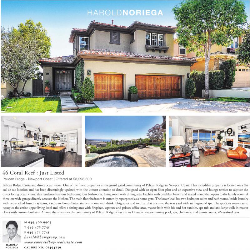 46 Coral Reef : Just Listed Pelican Ridge - Newport Coast | Offered at $3,298,800 Pelican Ridge, Civita and direct ocean views. One of the finest properties in the guard gated community of Pelican Ridge in Newport Coast. This incredible property is located on a flat cul-de-sac location and has been discerningly updated with the utmost attention to detail. Designed with an open floor plan and an expansive view and lounge terrace to capture the direct facing ocean views, this residence has four bedrooms, four bathrooms, living room with dining area, kitchen with breakfast bench and seated island that opens to the family room. A three-car wide garage directly accesses the kitchen. The main floor bedroom is currently repurposed as a home gym. The lower level has two bedroom suites and bathrooms, inside laundry with two stacked laundry systems, a separate bonus/entertainment room with drink refrigerator and wet bar that opens to the rear yard with an in-ground spa. The spacious master suite occupies the entire upper living level and offers a sitting area with fireplace, separate and private office area, master bath with his and her vanities, spa tub and and large walk in master closet with custom built-ins. Among the amenities the community of Pelican Ridge offers are an Olympic size swimming pool, spa, clubhouse and tennis courts. 46coralreef.com harold noriega m 949.400.9905 t 949.478.7745 f 949.478.7745 harold@homgroup.com www.emeraldbay-realestate.com cal bre no. 01494239