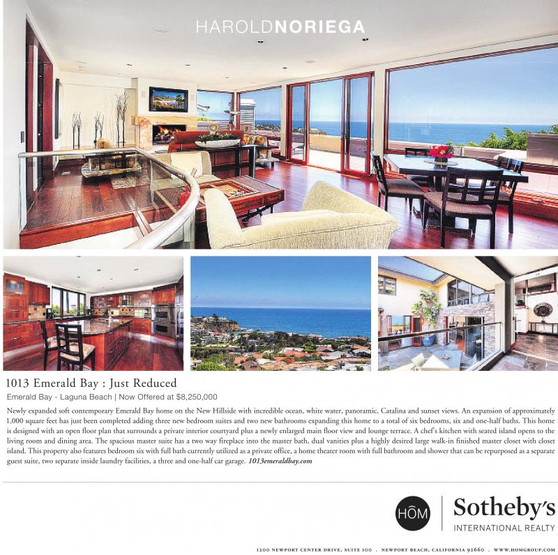 1013 Emerald Bay : Just Reduced Emerald Bay - Laguna Beach | Now Offered at $8,250,000 Newly expanded soft contemporary Emerald Bay home on the New Hillside with incredible ocean, white water, panoramic, Catalina and sunset views. An expansion of approximately 1,000 square feet has just been completed adding three new bedroom suites and two new bathrooms expanding this home to a total of six bedrooms, six and one-half baths. This home is designed with an open floor plan that surrounds a private interior courtyard plus a newly enlarged main floor view and lounge terrace. A chef's kitchen with seated island opens to the living room and dining area. The spacious master suite has a two way fireplace into the master bath, dual vanities plus a highly desired large walk-in finished master closet with closet island. This property also features bedroom six with full bath currently utilized as a private office, a home theater room with full bathroom and shower that can be repurposed as a separate guest suite, two separate inside laundry facilities, a three and one-half car garage. 1013emeraldbay.com 1200 newport center drive, suite 100 . newport beach, california 92660 . www.homgroup.com