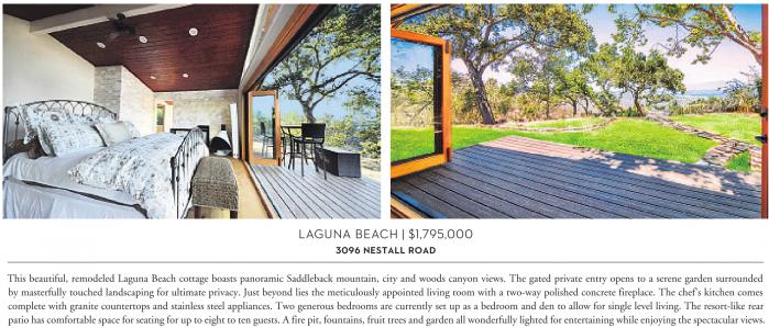 LAGUNA BEACH | $1,795,000 3096 NESTALL ROAD This beautiful, remodeled Laguna Beach cottage boasts panoramic Saddleback mountain, city and woods canyon views. The gated private entry opens to a serene garden surrounded by masterfully touched landscaping for ultimate privacy. Just beyond lies the meticulously appointed living room with a two-way polished concrete fireplace. The chef’s kitchen comes complete with granite countertops and stainless steel appliances. Two generous bedrooms are currently set up as a bedroom and den to allow for single level living. The resort-like rear patio has comfortable space for seating for up to eight to ten guests. A fire pit, fountains, fruit trees and garden all wonderfully lighted for entertaining while enjoying the spectacular views.