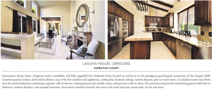 LAGUNA NIGUEL | $950,000 24986 PAM COURT Entertainers dream home. Gorgeous newly remodeled, and fully upgraded four bedroom home located on cul-de-sac in the prestigious guard gated community of San Joaquin Hills. Gourmet granite kitchen, dark wood cabinets, top of the line stainless steel appliances, ceiling fans, beamed ceilings, custom shutters, plus so much more. A secluded master suite flows into the master bathroom containing a separate walk-in shower, relaxing Jacuzzi tub, double vanity, and spacious walk-in closet. Nice private yard great for entertaining guests with built-in barbecue, outdoor fireplace, and tranquil fountains. Association amenities include two resort style pools and spas, sports park, tot lot and more.
