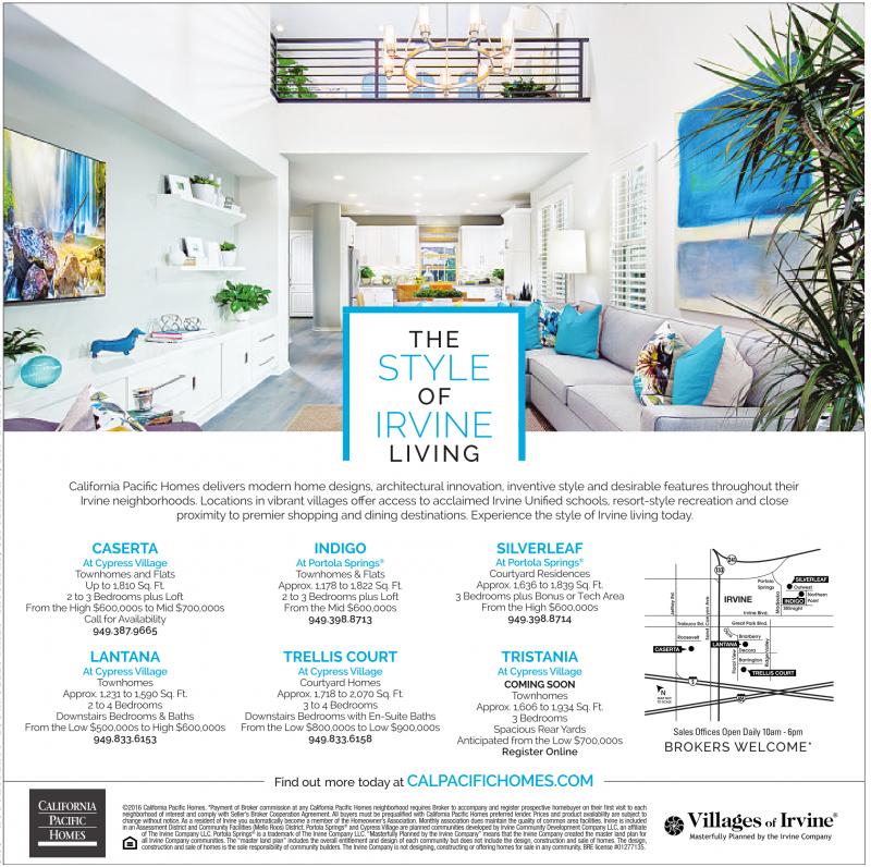 ©2016 California Pacific Homes. *Payment of Broker commission at any California Pacific Homes neighborhood requires Broker to accompanyand register prospective homebuyer on their first visit to each neighborhood of interest and comply with Seller’s Broker Cooperation Agreement. All buyers must be prequalified with California Pacific Homes preferred lender.Prices and product availability are subject to change without notice. As aresident of Irvine you automatically become amemberofthe Homeowner’sAssociation. Monthly association dues maintain the quality of common area facilities. Irvine is included in an Assessment District and Community Facilities (Mello Roos) District. Portola Springs ® and Cypress Village are planned communities developed by Irvine Community Development CompanyLLC,anaffiliate of The Irvine CompanyLLC.Portola Springs ® is atrademark of The Irvine CompanyLLC.“Masterfully Planned by the Irvine Company” meansthatthe Irvine Companycreated themaster land plan for all Irvine Company communities. The “master land plan” includes the overall entitlement and design of each community but does not include the design, construction and sale of homes. The design, construction and sale of homes is the sole responsibility of community builders. The Irvine Companyisnot designing, constructing or offering homes for sale in anycommunity.BRE license #01277135.