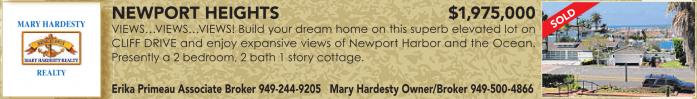 MARYHARDESTY REALTY NEWPORT HEIGHTS $1,975,000 VIEWS…VIEWS…VIEWS! Build your dream home on this superb elevated lot on CLIFF DRIVE and enjoy expansive views of Newport Harbor and the Ocean. Presently a 2 bedroom, 2 bath 1 story cottage. Erika Primeau Associate Broker 949-244-9205 Mary Hardesty Owner/Broker 949-500-4866