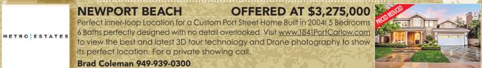 NEWPORT BEACH OFFERED AT $3,275,000 Perfect inner-loop Location for a Custom Port Street Home Built in 2004! 5 Bedrooms 6 Baths perfectly designed with no detail overlooked. Visit www.1841PortCarlow.com to view the best and latest 3D tour technology and Drone photography to show its perfect location. For a private showing call. Brad Coleman 949-939-0300 See also