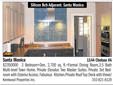 Santa Monica 1144Chelsea#A $2350000 3 Bedroom+Den, 2,700 sq. ft.+Formal Dining Room,3.5 Bath Multi-level Town Home. Private Elevator.Two Master Suites. Private 3rd Bedroomwith Exterior Access. Fabulous Kitchen.Private Roof TopDeck with Views!