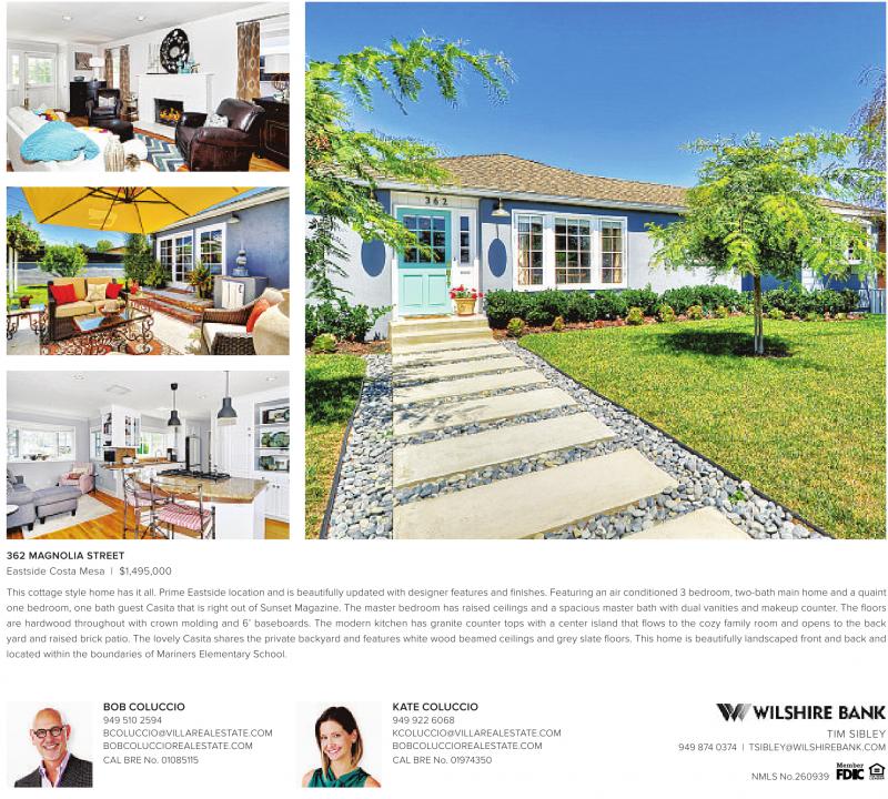 362 MAGNOLIA STREET Eastside Costa Mesa | $1,495,000 This cottage style home has it all. Prime Eastside location and is beautifully updated with designer features and finishes. Featuring an air conditioned 3 bedroom, two-bath main home and a quaint one bedroom, one bath guest Casita that is right out of Sunset Magazine. The master bedroom has raised ceilings and a spacious master bath with dual vanities and makeup counter. The floors are hardwood throughout with crown molding and 6’ baseboards. The modern kitchen has granite counter tops with a center island that flows to the cozy family room and opens to the back yard and raised brick patio. The lovely Casita shares the private backyard and features white wood beamed ceilings and grey slate floors. This home is beautifully landscaped front and back and located within the boundaries of Mariners Elementary School. BOB COLUCCIO 949 510 2594 BCOLUCCIO@VILLAREALESTATE.COM BOBCOLUCCIOREALESTATE.COM CAL BRE No. 01085115 KATE COLUCCIO 949 922 6068 KCOLUCCIO@VILLAREALESTATE.COM BOBCOLUCCIOREALESTATE.COM CAL BRE No. 01974350 TIM SIBLEY 949 874 0374 | TSIBLEY@WILSHIREBANK.COM NMLS No.260939