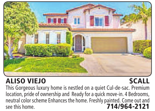 ALISO VIEJO $CALL This Gorgeous luxury home is nestled on aquiet Cul-de-sac. Premium location,pride of ownership and Readyfor aquickmove-in. 4Bedrooms, neutral color scheme Enhances thehome.Freshlypainted. Come outand seethis home. 714/964-2121