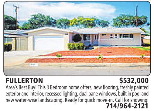 FULLERTON $532,000 Area’s Best Buy! This 3Bedroomhomeoffers; new flooring,freshlypainted exteriorand interior, recessedlighting, dual pane windows, builtinpooland new water-wiselandscaping. Readyfor quickmove-in. Call for showing: