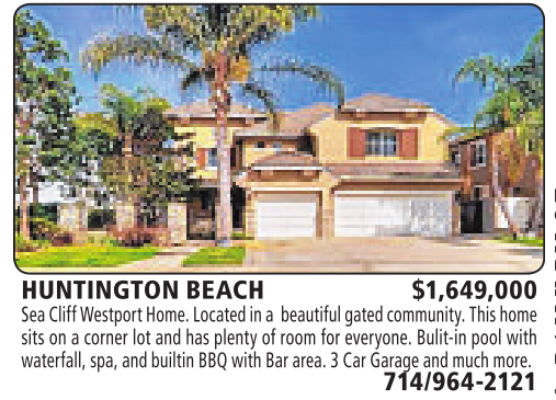 HUNTINGTON BEACH $1,649,000 SeaCliff Westport Home.Located in a beautifulgatedcommunity. This home sits on acorner lot and has plenty ofroom for everyone. Bulit-in pool with waterfall, spa, andbuiltin BBQwithBar area.3Car Garage andmuch more.