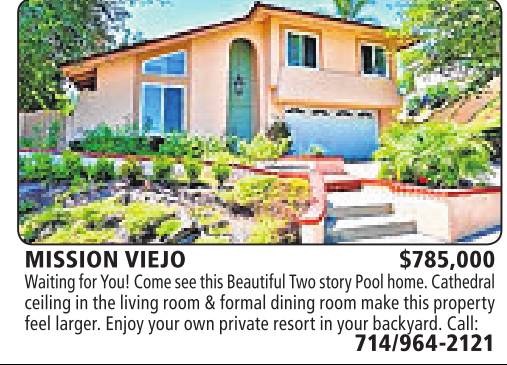 MISSION VIEJO $785,000 Waitingfor You! Come seethis BeautifulTwo storyPoolhome.Cathedral ceiling in theliving room &formal dining room make this property feel larger. Enjoy your ownprivateresortinyour backyard. Call: