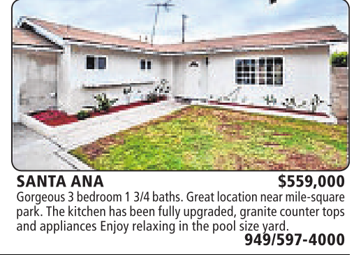 SANTA ANA $559,000 Gorgeous 3bedroom 13/4 baths. Greatlocationnearmile-square park.The kitchen has been fullyupgraded, granitecounter tops and appliances Enjoyrelaxinginthe poolsize yard.