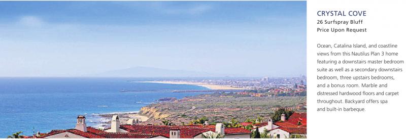 CRYSTAL COVE 26 Surfspray Bluff Price Upon Request Ocean, Catalina Island, and coastline views from this Nautilus Plan 3 home featuring a downstairs master bedroom suite as well as a secondary downstairs bedroom, three upstairs bedrooms, and a bonus room. Marble and distressed hardwood floors and carpet throughout. Backyard offers spa and built-in barbeque. See also
