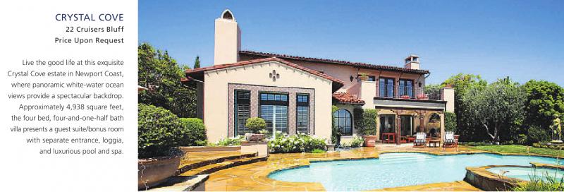 CRYSTAL COVE 22 Cruisers Bluff Price Upon Request Live the good life at this exquisite Crystal Cove estate in Newport Coast, where panoramic white-water ocean views provide a spectacular backdrop. Approximately 4,938 square feet, the four bed, four-and-one-half bath villa presents a guest suite/bonus room with separate entrance, loggia, and luxurious pool and spa. See also
