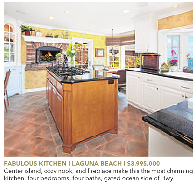 FABULOUS KITCHEN l LAGUNA BEACH l $3,995,000 Center island, cozy nook, and fireplace make this the most charming kitchen, four bedrooms, four baths, gated ocean side of Hwy.