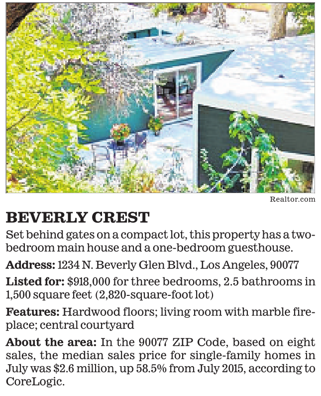Realtor.com BEVERLY CREST Set behind gates on a compact lot, this property has a twobedroom main house and a one-bedroom guesthouse. Address: 1234 N. Beverly Glen Blvd., Los Angeles, 90077 Listed for: $918,000 for three bedrooms, 2.5 bathrooms in 1,500 square feet (2,820-square-foot lot) Features: Hardwood floors; living room with marble fireplace; central courtyard About the area: In the 90077 ZIP Code, based on eight sales, the median sales price for single-family homes in July was $2.6 million, up 58.5% from July 2015, according to CoreLogic. See also